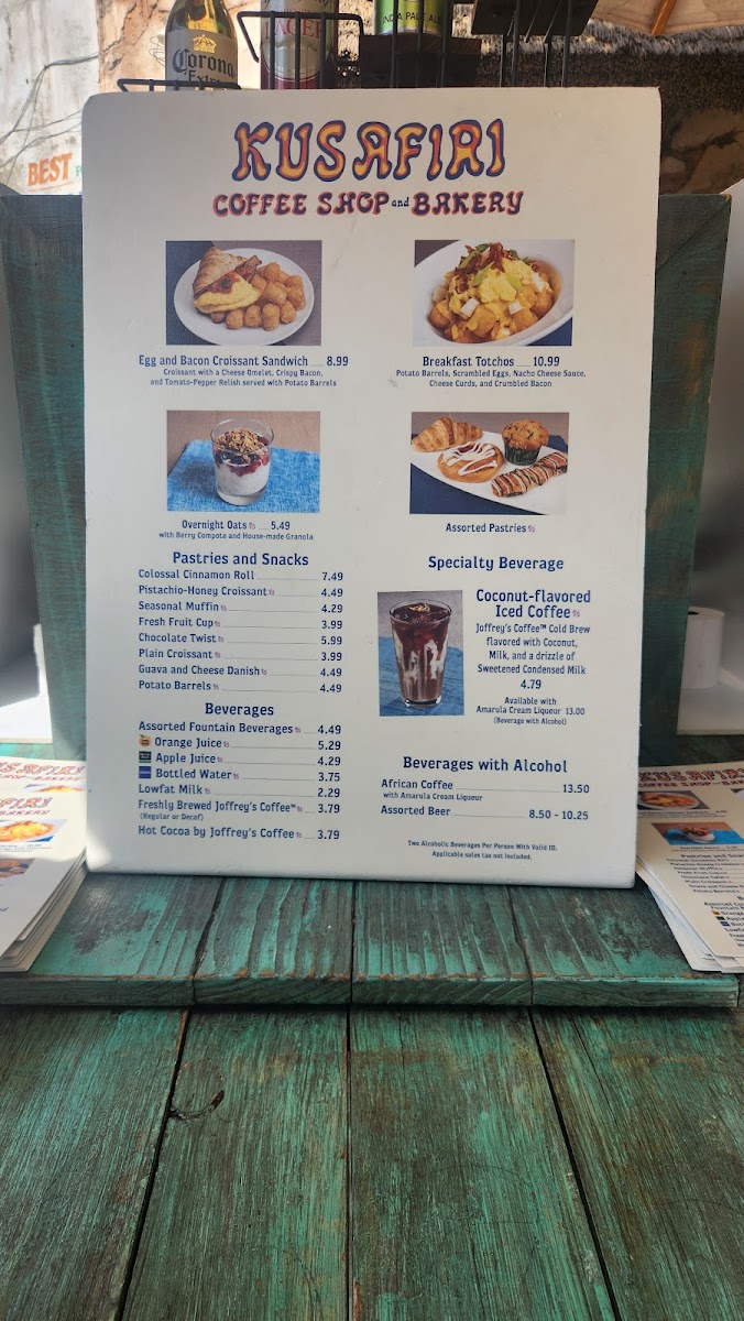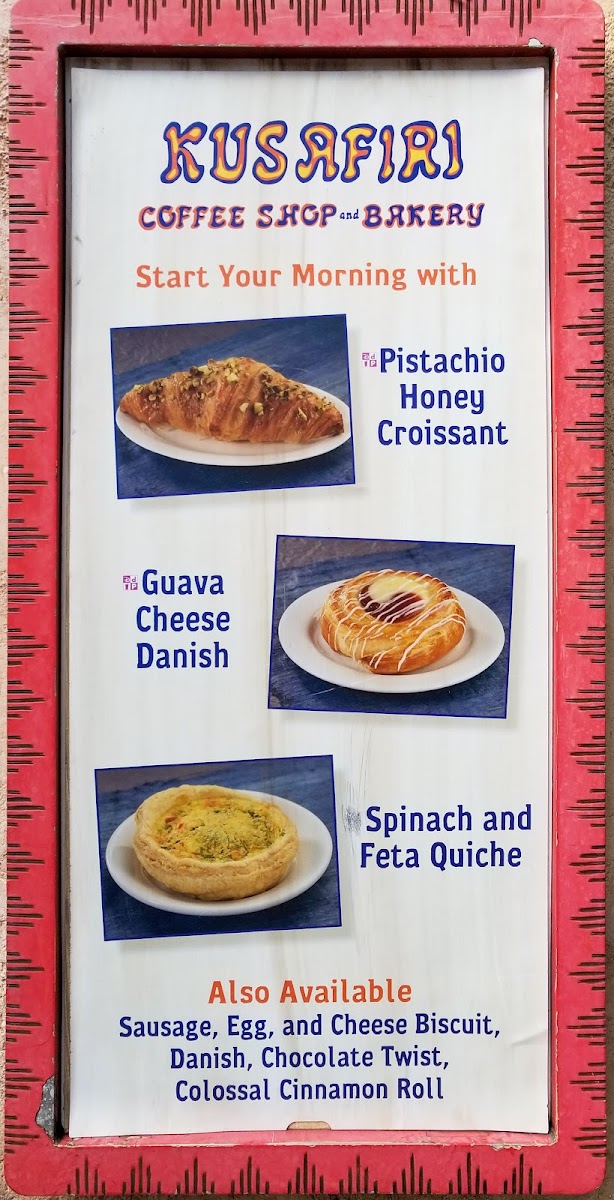 This diverse and tempting menu ensures that whether you're in the mood for a light snack, a full breakfast, or a refreshing drink, Kusafiri Coffee Shop & Bakery has something for everyone.